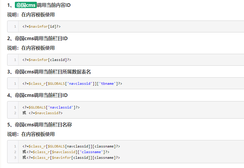 1 <?=$class_r[$GLOBALS['navclassid']]['tbname']?>4、帝国cms调用当前栏目ID