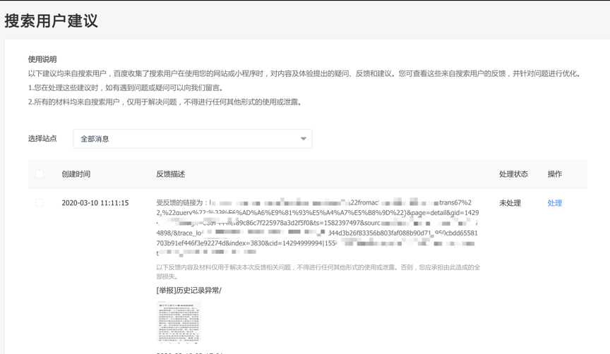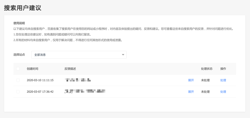 近期,百度搜索资源平台上线了搜索用户建议专区,该专区收集展示了搜索用户在使用您网站时,对网站内容和体验等方面提出的意见和建议。