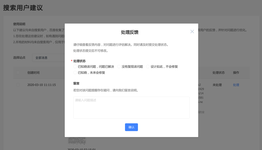 为保障百度搜索用户体验,建议广大网站开发者关注搜索用户建议专区消息动态,及时处理用户建议及反馈问题。
