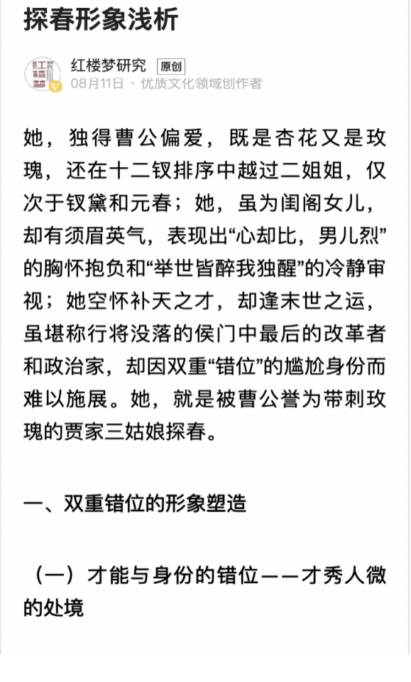 △内容质量优质,文字优美,在总结探春的性格特征之外,还运用了具体细节事例加以佐证,有理有据。
