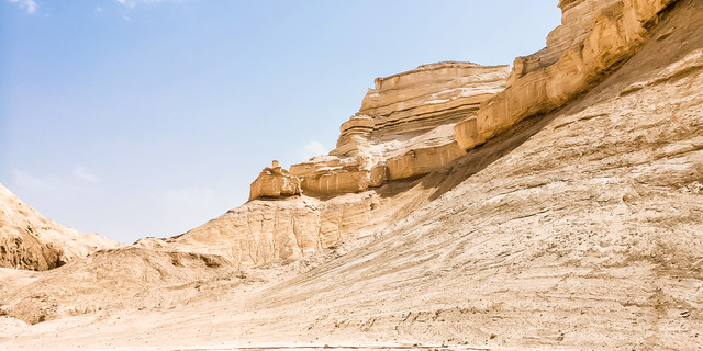 驱车行驶在颠簸的犹大沙漠,终点处是峡谷断层,崖壁松软如同面包,每一场颠簸都仿佛在上演生死时速。远处可以看到墨绿色的死海平静的铺在那里,近处则是一片毫无生机的黄色,有的只是形状大小变化的山石和天空中酷热难耐的太阳。