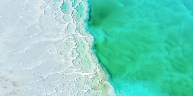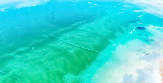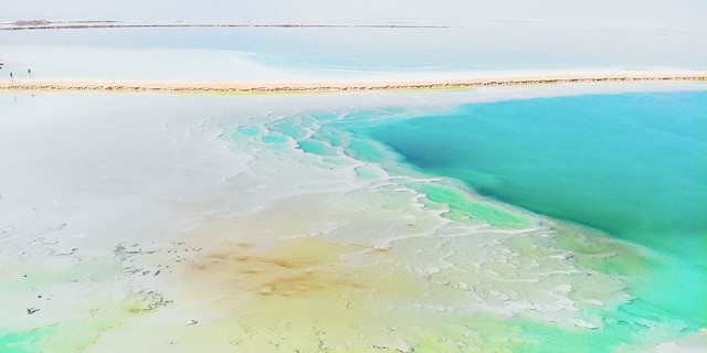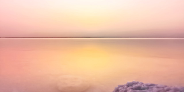 死海远远的望去,湛蓝中斑驳着丝丝碧绿,甚是妖娆。走到近处,缺少了生物的海水看起来清澈透明,海底的一沙一石都清晰可见。由于盐分的沉积,很多海底都凝结出了厚厚的盐层,走在上面脚掌扎的很疼!也正因为海底矿物质的堆积,造就了死海多彩的颜色。