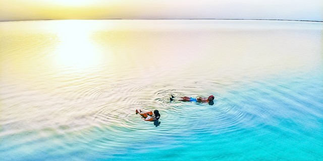 高浓度的岩盐分致使如此浩荡的海水中没有鱼虾、水草,甚至连海边也寸草不生,但是人们在这无鱼无草的海水里,竟能自由游弋,即使是不会游泳的人,也总是浮在水面上。