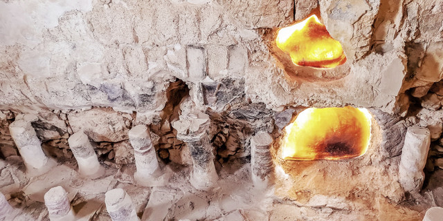 宽大的屋舍,巨大的粮仓。土耳其浴室中,当年精美的装饰仍有残迹,烧火加热的痕迹也宛然。被黄沙淹没三分之二的城堡也被发掘出来,拱门、望塔、浴场,蓄水池。