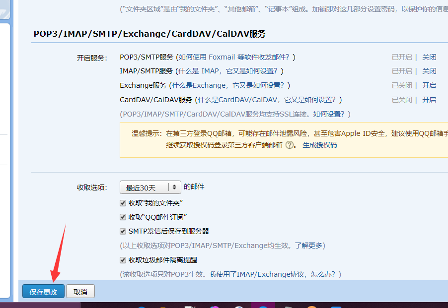 配置好了以后需要进入qq邮箱左上角有个设置,点击,然后账号,然后POP3/IMAP/SMTP/Exchange/CardDAV/CalDAV服务: