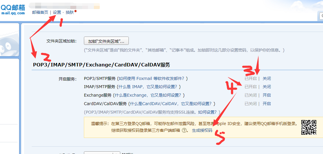 第二步:配置邮箱 打开qq邮箱,进入qq邮箱左上角有个设置,点击,然后账号,然后扎到POP3/IMAP/SMTP/Exchange/CardDAV/CalDAV服务:开启以下两项服务: